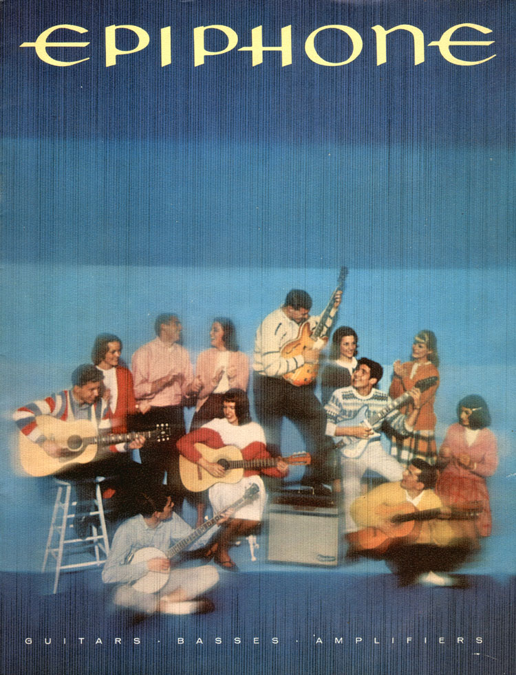 Epiphone 1964 'guitars, basses, amplifiers' catalog. The front cover shows a number of musicians/ audience playing a selection of Epiphone electric guitars and acoustic guitars, with a banjo and amplifier - representing all the different product lines available from Epiphone at this time. No upright acoustic basses are shown (or included in this catalog) - they were phased out around this time, though a small number did ship from Kalamazoo in 1964