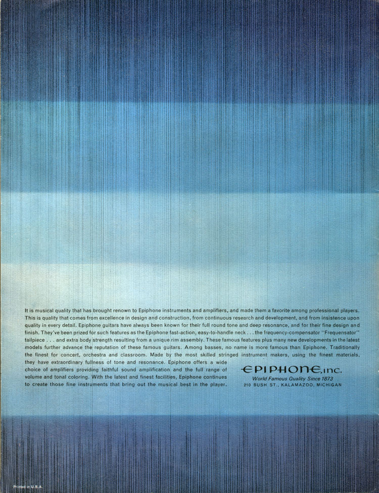 It is musical quality that has brought renown to Epiphone instruments and amplifiers, and made them a favourite among professional players. This is quality that comes from excellence in design and construction, from continuous research and development, and from insistence upon quality in every detail. Epiphone guitars have always been known for their full round tone and deep resonance, and for their fine design and finish. They've been prized for such features as the Epiphone fast-action, easy-to-handle neck... the frequency-compensator “Frequensator” tailpiece... and extra body strength resulting from a unique rim assembly. These famous features plus many new developments in the latest models further advance the reputation of these famous guitars. Among basses, no name is more famous than Epiphone. Traditionally the finest for concert, orchestra and classroom. Made by the most skilled stringed instrument makers, using the finest materials, they have extraordinary fullness of tone and resonance. Epiphone offers a wide choice of amplifiers providing faithful sound amplification and the full range of volume and tonal coloring. With the latest and finest facilities, Epiphone continues to create those fine instruments that bring out the musical best in the player.