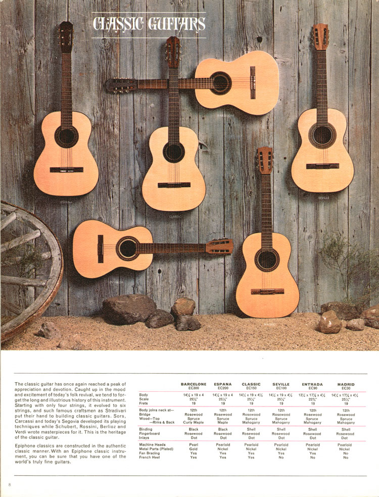 Epiphone 1964 full line catalog. Epiphone classic acoustic guitars. Page 8. Epiphone Espana, Classic, Seville, Entrada and Madrid classic acoustic guitars.