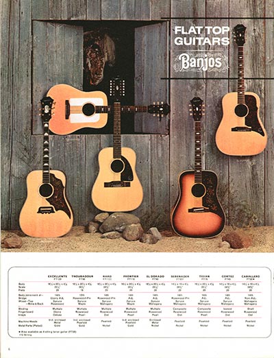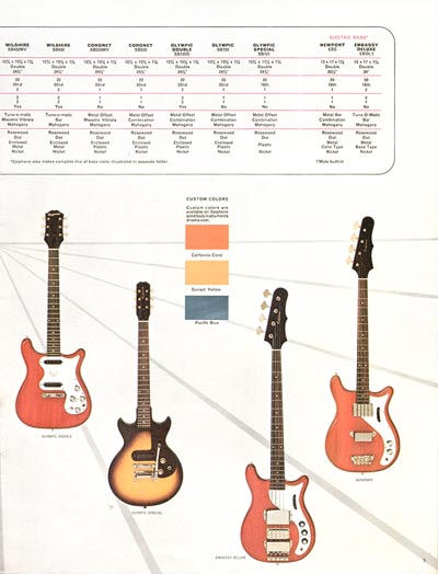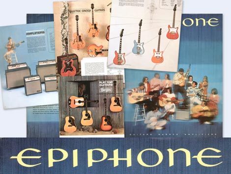 At twelve pages, the 1964 Epiphone catalogue was half the size of the previous issue, but it still managed to include more guitars. This was (CMI-owned) Epiphone's first catalogue to show its range in colour, and also the first not to feature Epiphone upright (acoustic) basses, which were just being phased out. It does feature numerous electric, classic, flat top and archtop acoustic guitars, as well as basses, banjos, amplifiers and just one mandolin. To jump to a page click on the images, or click on a model name from the list below.