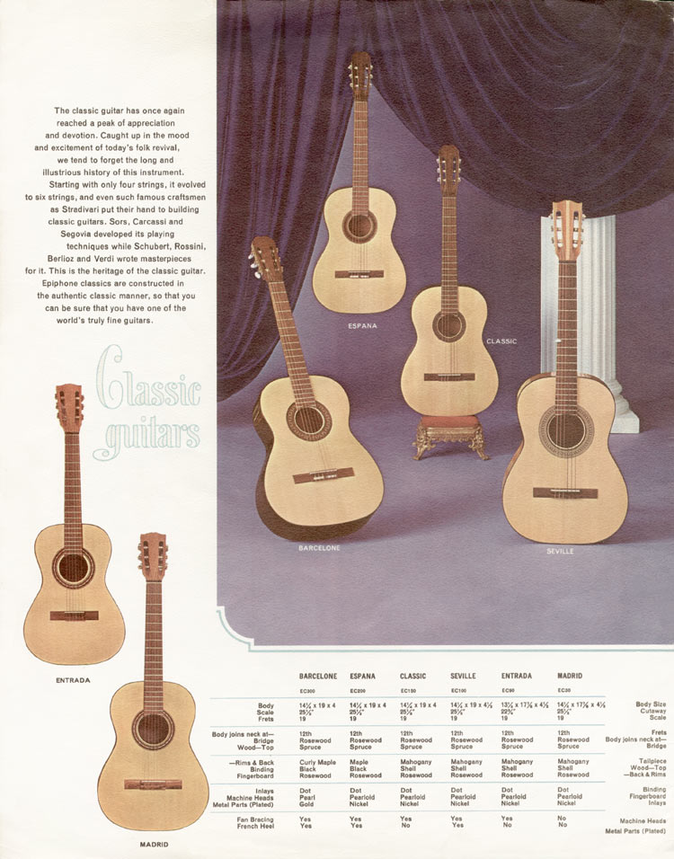 Epiphone 1966 full line catalog. Page 10, Epiphone classic guitars. The range of Epiphone classic guitars is unchanged from that of the previous Epiphone catalog: Barcelone EC 300; Espana EC 200; Classic EC 150; Seville EC 100; Entrada EC 90; and Madrid EC 30. The description is also identical: