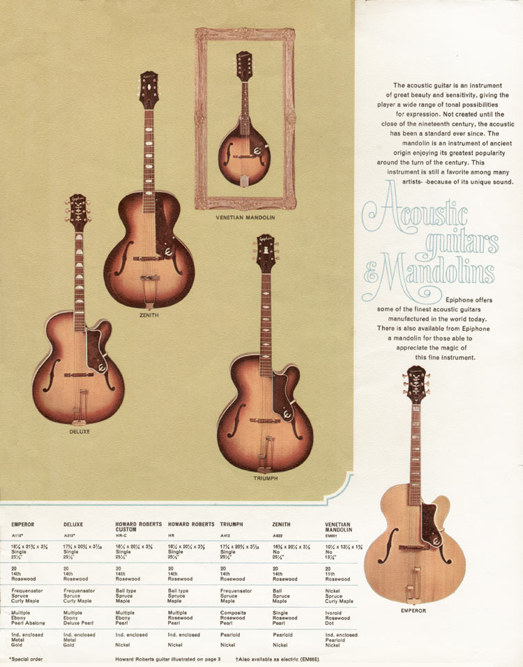Epiphone 1966 full line catalog. Page 11, Epiphone carved top acoustic guitars: Epiphone Emperor A112, Deluxe A212, Howard Roberts HR-S, HR-C, Triumph A412 and Zenith A622; and the Epiphone Venetian Mandolin EM66.