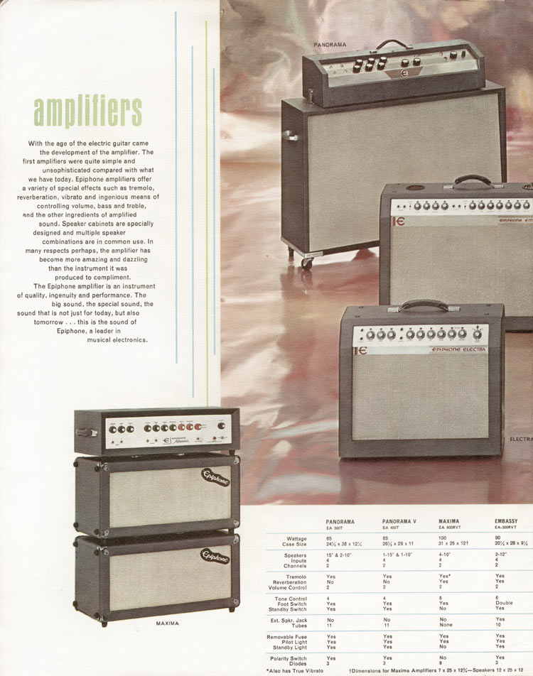 The Epiphone Panorama (EA 500T) and Panorama V (EA 400T) amplifiers were the most expensive amplifiers in the line in 1965, but by 1966 these were no longer listed in price lists; sales of the EA 500T and EA 400T were dismal, with just 106 and 37 units shipped respectively between 1963 and 1966.