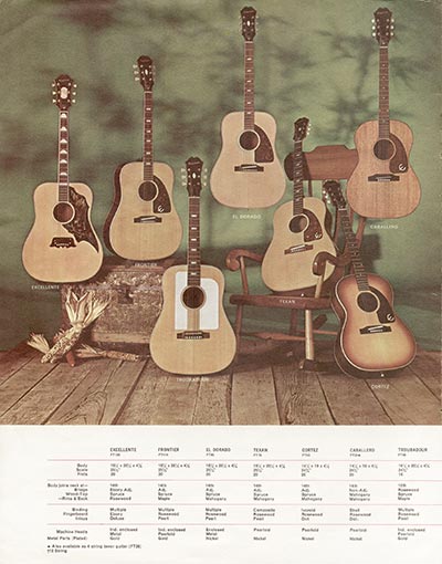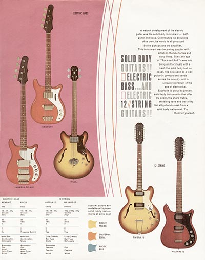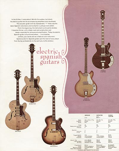 The 1966 Epiphone catalog was the last to be produced under the ownership of CMI, and the last to feature guitars built in the legendary Gibson Kalamazoo plant in Michigan USA. Production did continue a little longer but was moved to Japan, with completely new guitar designs from 1969.
