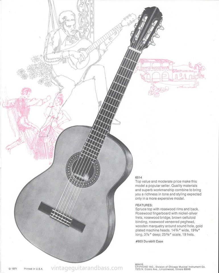 This single sided insert gives specifications for the Epiphone 6514 classic acoustic guitar, produced for Epiphone by Aria, at the Japanese Matsumoku plant.