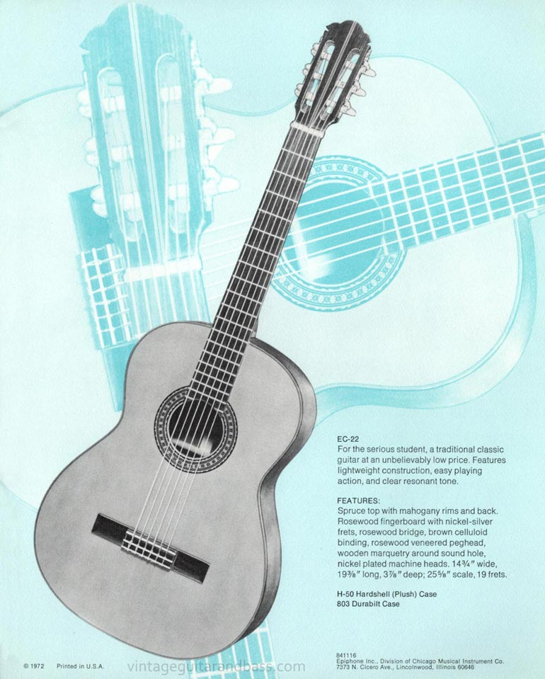 This single sided insert gives specifications for the Epiphone EC-22 classic acoustic guitar, produced for Epiphone by Aria, at the Japanese Matsumoku plant.