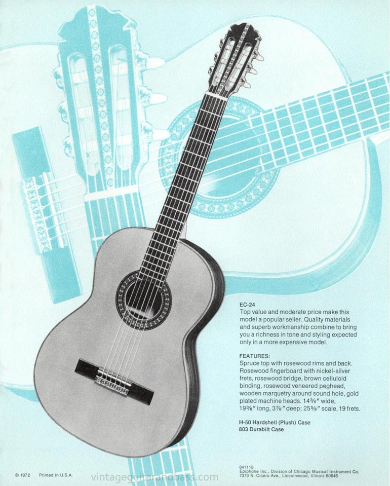 This single sided insert gives specifications for the Epiphone EC-24 classic acoustic guitar, produced for Epiphone by Aria, at the Japanese Matsumoku plant.