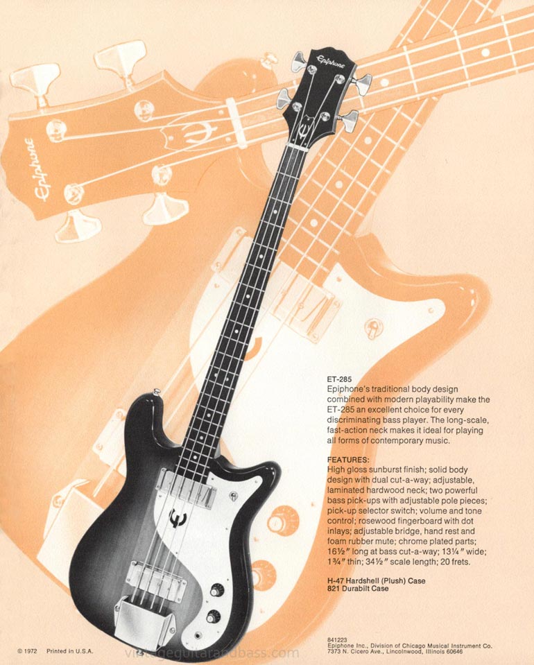 This single sided insert gives specifications for the Epiphone ET-285 solid body electric bass, produced for Epiphone by Aria, at the Japanese Matsumoku plant. The guitar pictured is an early example, with the same metal-covered pickups