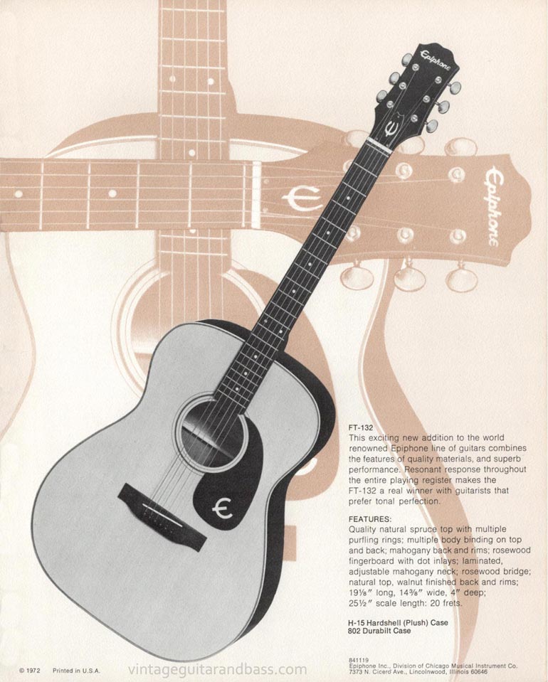 This single sided insert gives specifications for the Epiphone FT-132 classic acoustic guitar, produced for Epiphone by Aria, at the Japanese Matsumoku plant. This is the second insert published for the FT-132. This sheet replaces this one from earlier in 1971.