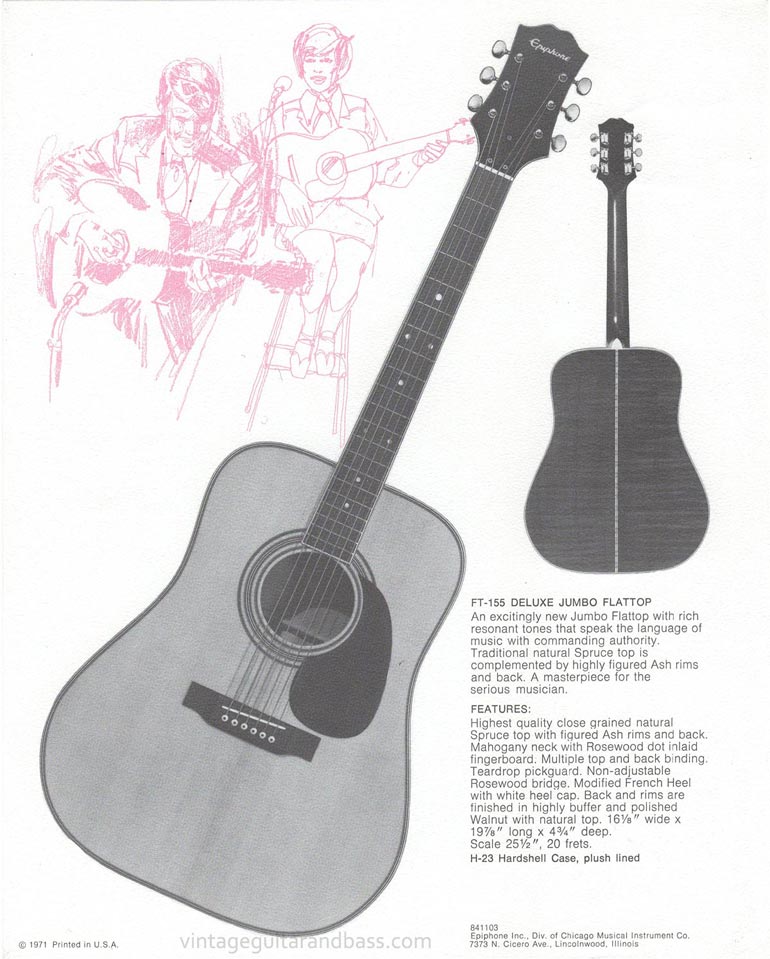 This single sided insert gives specifications for the Epiphone FT-155 deluxe jumbo acoustic guitar, produced for Epiphone by Aria, at the Japanese Matsumoku plant. This guitar was not one of the first tranche of Japanese models, but was added to the flattop acoustic range at some point in 1971. The FT-155 was the top-of-the-line acoustic model, and as such was the most expensive acoustic in the June 1972 US price list, at $159.50.