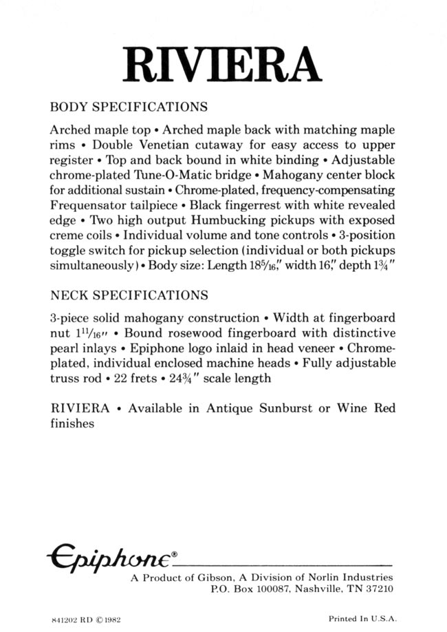 In the early 1980s, a number of Epiphone's older models were reissued, using the original names, and (broadly) the original specifications. The Riviera of 1982 was produced by Aria at the Japanese Matsumoku facilities and looked quite like the 1960s Gibson Kalamazoo-made Riviera: it had the same body style, Frequensator tailpiece, parallelogram neck markers, and late sixties-style Epiphone headstock. The pickups, however, had no covers, just exposed cream bobbins.