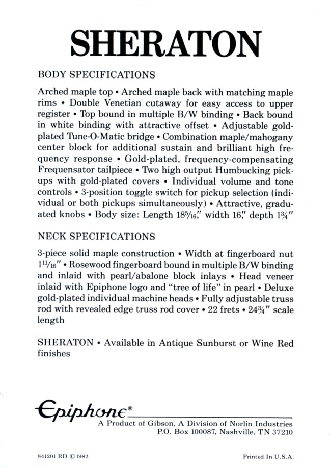 The reissued Epiphone Sheraton of 1982 bore some comparison to the 1960s Gibson Kalamazoo-made original, with Frequensator tailpiece, pearl/abalone triangle block markers, and the famous tree of life headstock inlay. The old Natural/Shaded/Cherry finishes were updated though: a rich Antique Sunburst, as seen below, or Wine Red. The neck had changed from the typical 60s one-piece mahogany, to three piece laminate maple. The center block from maple to maple/mahogany.