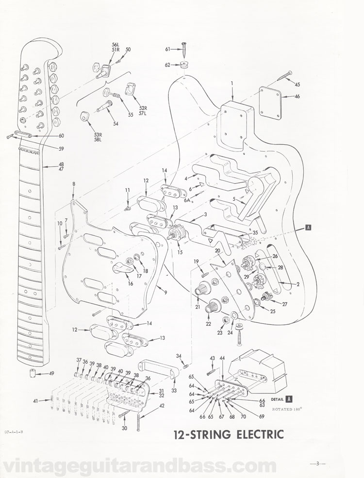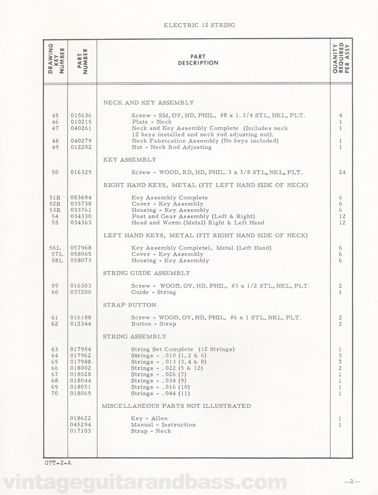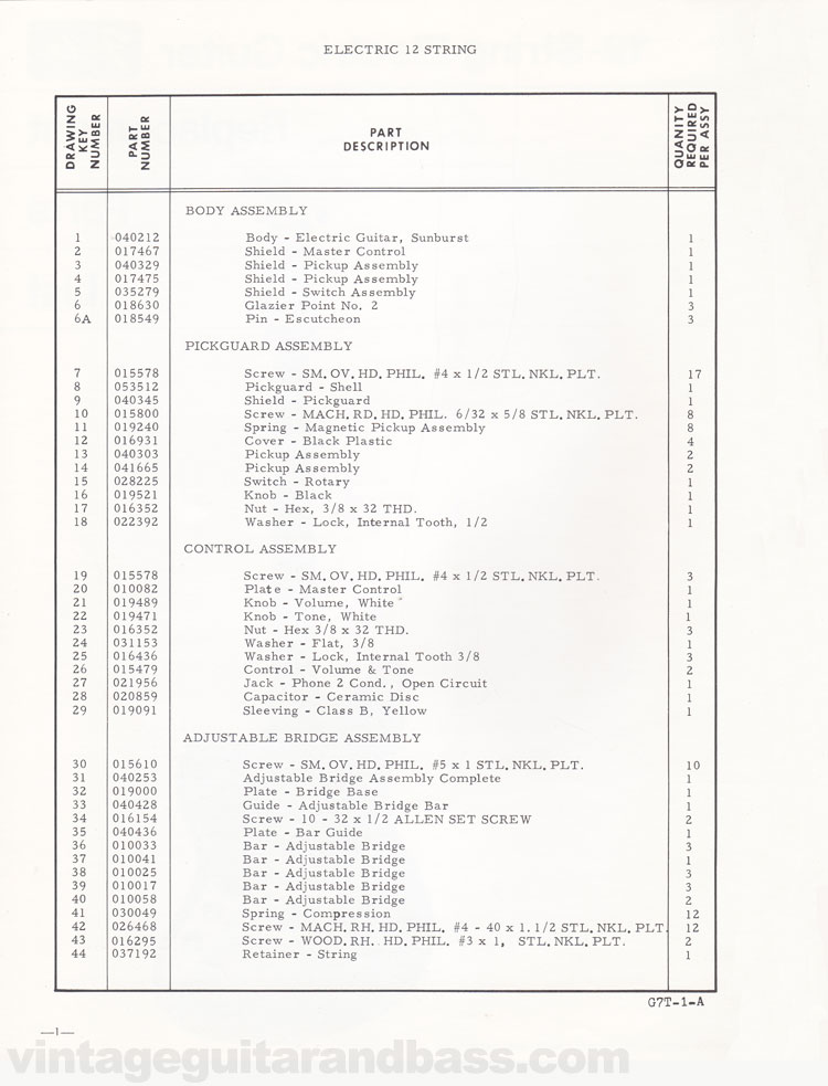 One interesting feature of the Electric XII was the fact that it was available in a selection of neck widths, wider, or narrower, depending on the players preference. This was mentioned in all price lists from launch until early 1968, however was no longer listed as an option as of July '68 literature. It should be noted that only one neck is listed within this part list, and no mention is made of it's width. Furthermore a few 12-Strings were given block inlays (as shown on sheet 1, below) but the majority had dots (as shown on sheet 4, below). Again no mention of this is made here. The model was discontinued by early 1969, and it is likely that production was already winding down; perhaps only standard size necks were being shipped at this time.