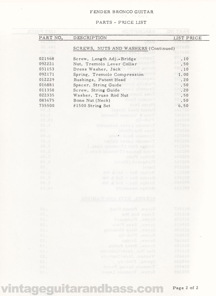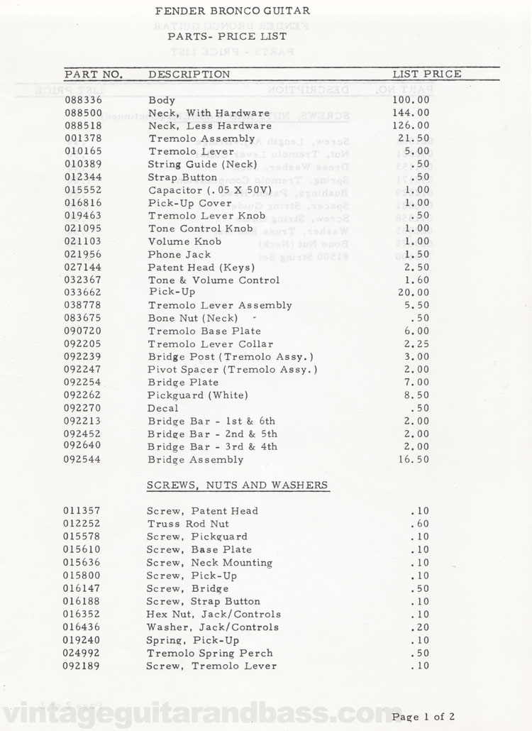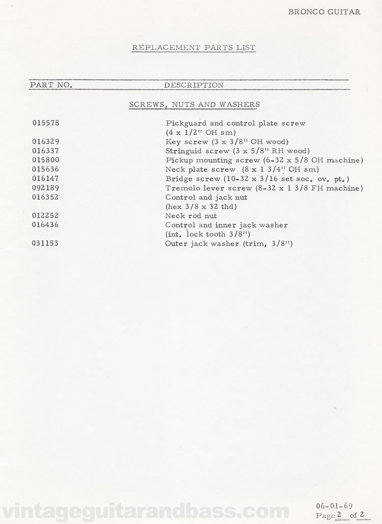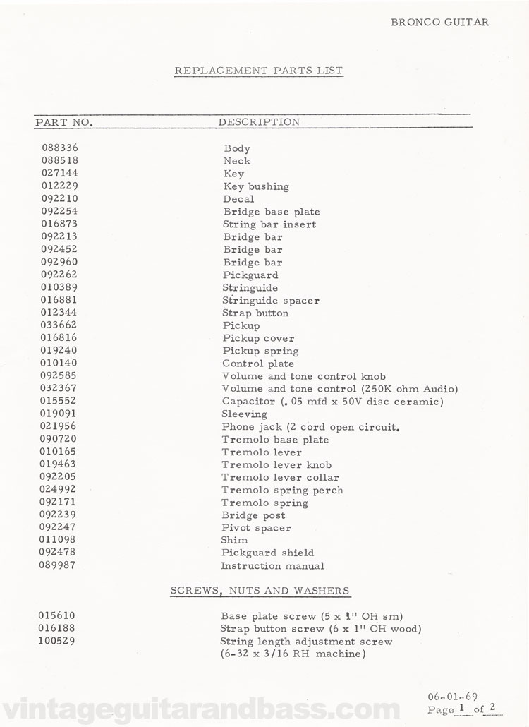 A list of parts sent to Fender guitar dealers in June 1969, as part of the then-current Fender Service Manual. It lists and describes recommended replacement components for early versions of the Fender Bronco solid body electric. Part prices are listed on the final two sheets. See also the 1976 parts list, which is more appropriate for the mid-late seventies version of this guitar.