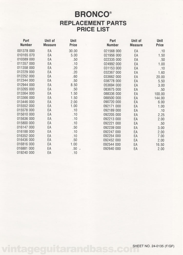 A list of parts for the Fender Bronco guitar from the 1976 Fender Service Manual. It lists and describes recommended replacement components for later versions of the guitar. The '76 list is an improvement on the 1969 list, in that it includes a labelled diagram of the tremolo unit, volume and tone circuitry and the guitar itself. The final page gives prices for the parts listed on the previous two pages.