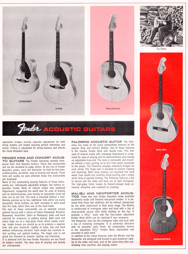 In December 1965 these guitars were priced as follows: Fender King $267-$365, Concert $242-$340, Palamino $195, Malibu $155 and Newporter $115