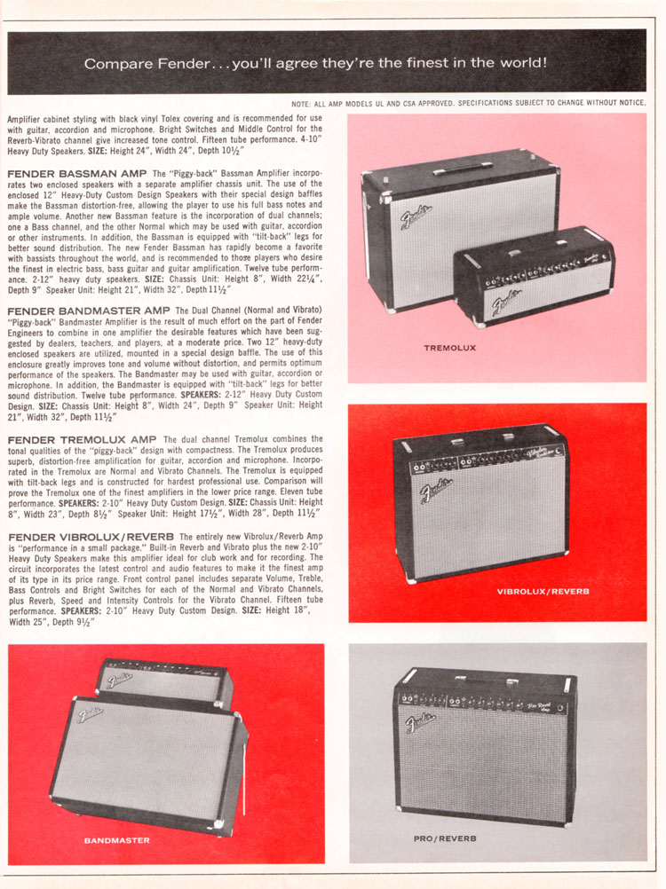 Fender 1965/1966 guitar catalogue. Page 7. Details of five Fender amplifiers: the Fender Bassman, Fender Bandmaster, Fender Tremolux and Fender Pro/Reverb. This was actually the last catalogue appearance of the Tremolux, which was deleted from the Fender range in 1966.