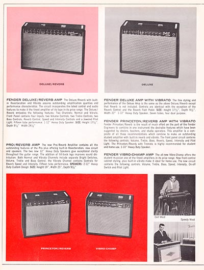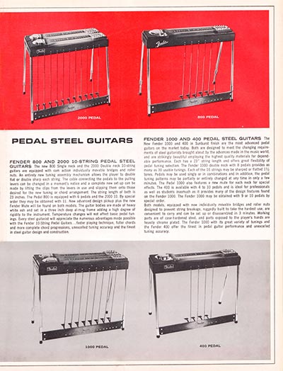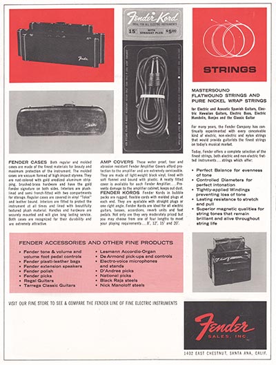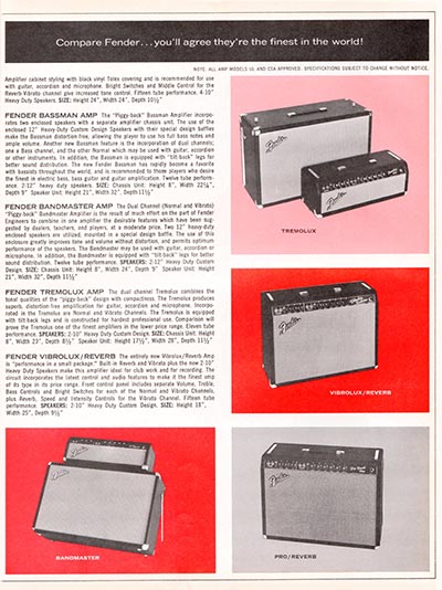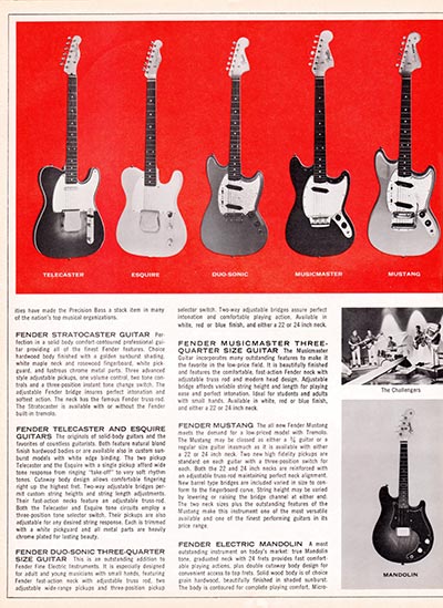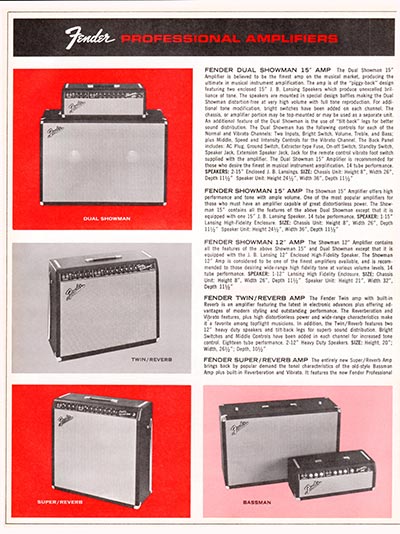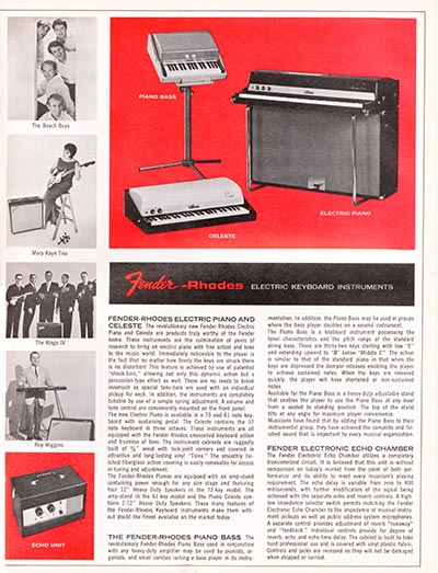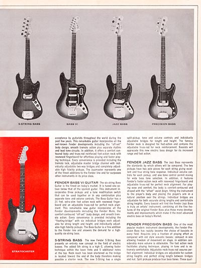 Two new models make their first catalogue appearance this year, the Fender Electric XII and the Fender 5-string bass, both introduced earlier in 1965.