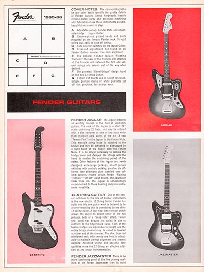 Like the 1964-65 brochure also reproduced on this site, it was included free (actually pages 29-40) inside the 1965 Annual guitar issue of music magazine Down Beat (July 1st, 1965; Jim Hall cover). 1965 was a good year for US guitar sales; this issue sold well, and is quite often available on ebay - because this brochure was part of the magazine, and not an insert, it is usually present.