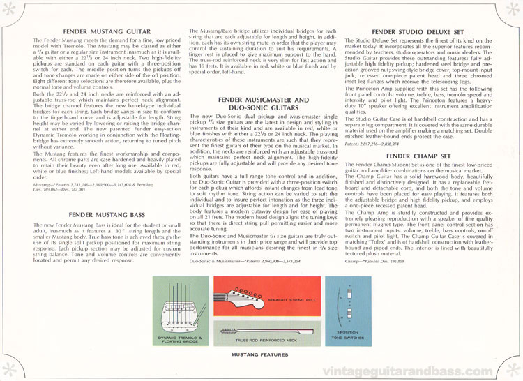 Fender 1966-67 guitar and bass catalogue. Page 15. Description of several lower-priced guitars, and steel guitar sets: Fender Mustang guitar, Mustang bass, Musicmaster, Duo Sonic, Champ and Studio Deluxe sets. This is the right hand page of a two page spread. An image of the guitars described is shown on the previous page.