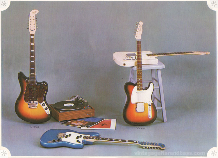 The 12-String, was one of Fenders newer guitars, first produced from early 1965, and is shown here in it's standard Sunburst finish, and (laying down) in the premium DuPont finish - Lake Placid blue? - note the matching headstock. The majority of these guitars had unbound necks with dot inlays - but here they are shown bound with blocks. Nice! Compare to the corresponding pages in the 1965, 1968 and 1969 Fender catalogues.