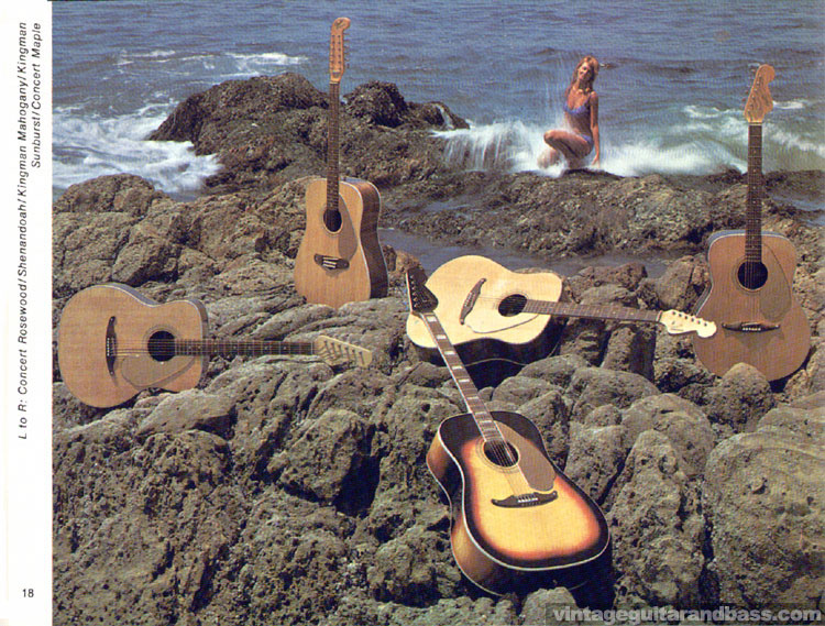 Fender 1968 guitar and bass catalog. Page 20. Image of three Fender acoustic guitars, the Concert Rosewood and Maple, Kingman Mahogany and Sunburst and the twelve-string Shenandoah. These guitars all had a spruce top, but differing back and sides. The Kingman, for example, as well as being available with the Wildwood stain (see page 16) was offered in price lists with a choice of rosewood, vermillion, zebra, mahogany, and natural maple back and sides.
