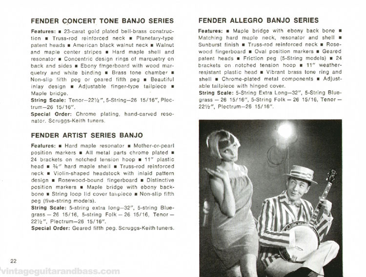 Fender 1968 guitar and bass catalog. Page 24. The complete fender banjo range is demonstrated on this two page spread. This is the left hand page, an image of the banjos described is on the following page.