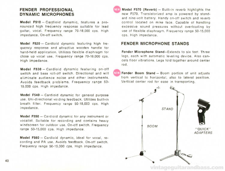 Fender 1968 guitar and bass catalog. Page 42. Fender vocal and instrument microphones. Models F510, F520, F530, F540, F550, F560, F570. Left hand page of a two page spread - accompanying image are on the next page.
