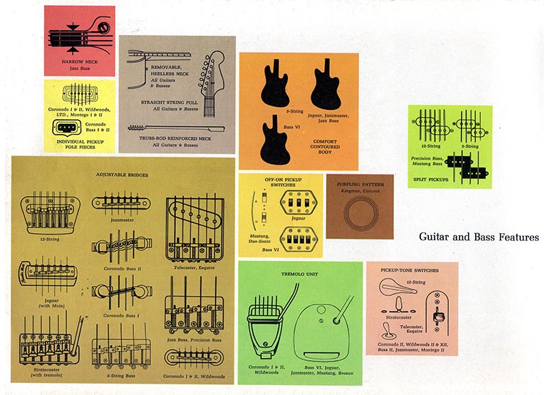 Page 22 shows some colourful illustrations of a number of Fender guitar and bass 'features': necks, contoured bodies, pickups, bridges, tremolos and switches.