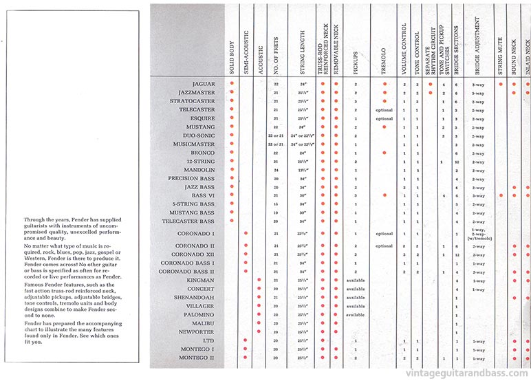 Fender has prepared the accompanying chart to illustrate the many features found only in Fender. See which ones fit you.