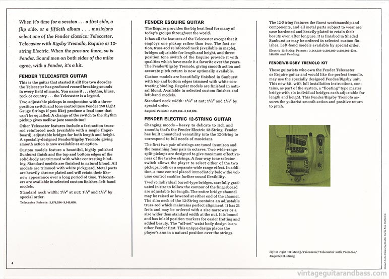 Page 4 gives descriptions of three Fender solid body guitars, with the accompanying image on the next page. These are the single pickup Fender Esquire, the dual pickup Fender Telecaster, and the final catalog appearance of the Electric 12-String. Several versions of each of these guitars were listed in 1969, with differing levels of ornamentation and fretboard woods.