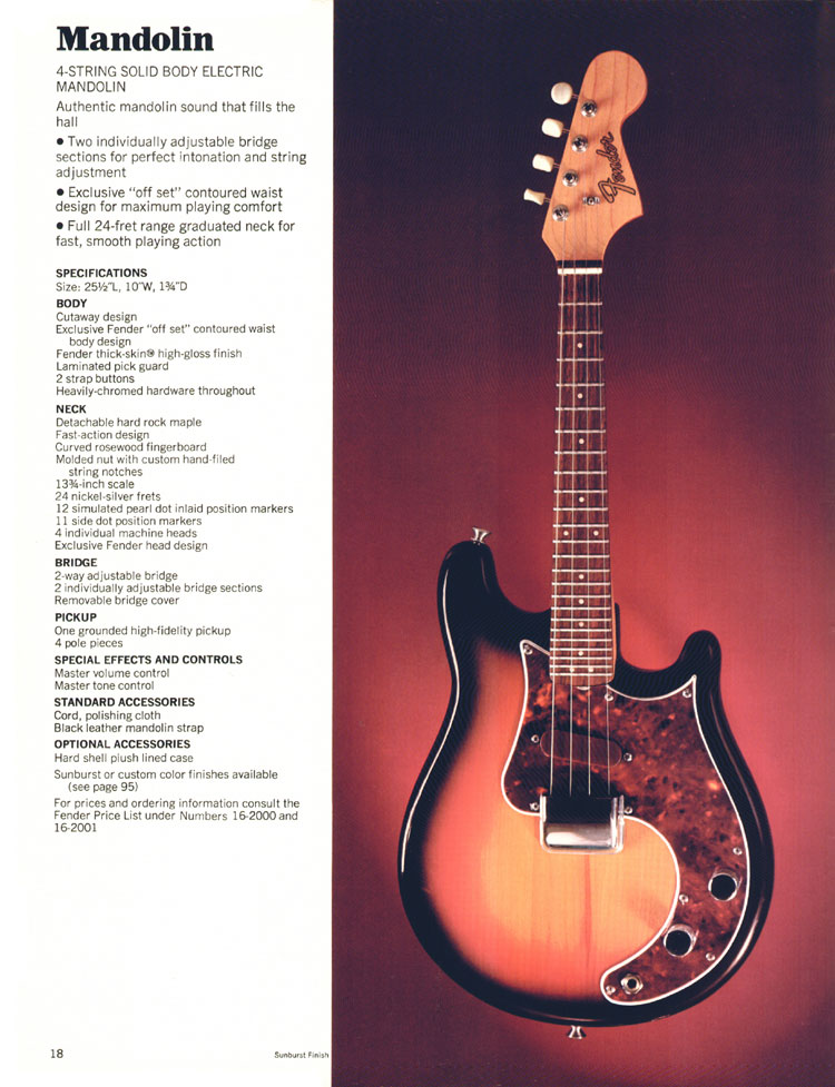 Fender 1970 guitar and bass catalog. Page 18. Details of the Fender electric mandolin