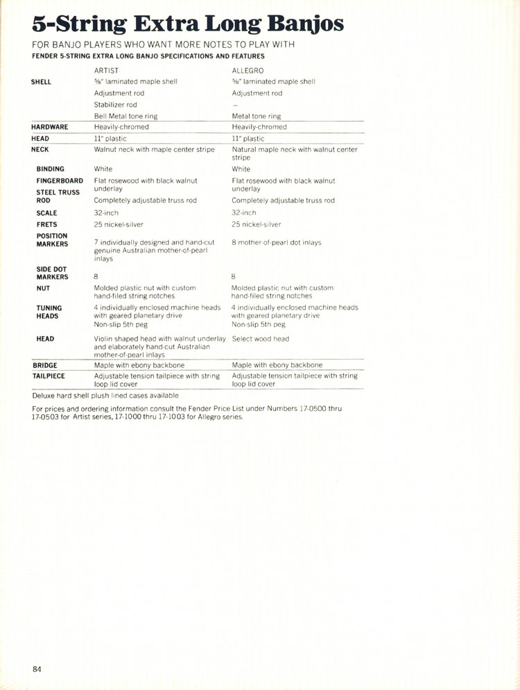 Fender 1970 guitar and bass catalog. Page 84. Details of the Fender 5-String Extra Long banjos.