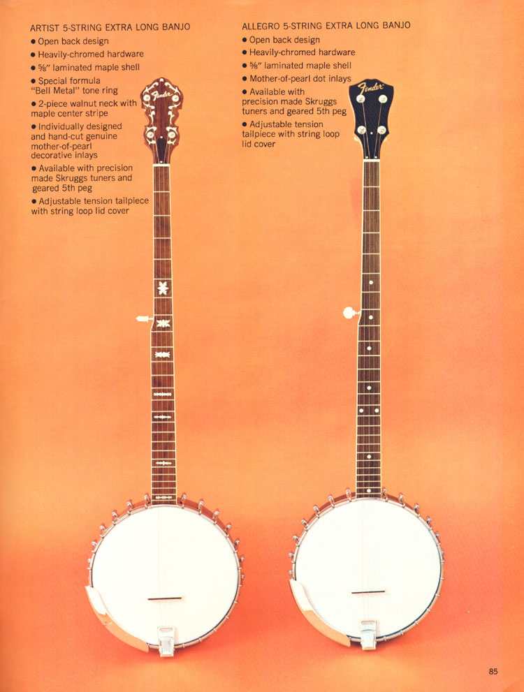 Fender 1970 guitar and bass catalog. Page 85. Details of the Fender 5-String Extra Long banjos.