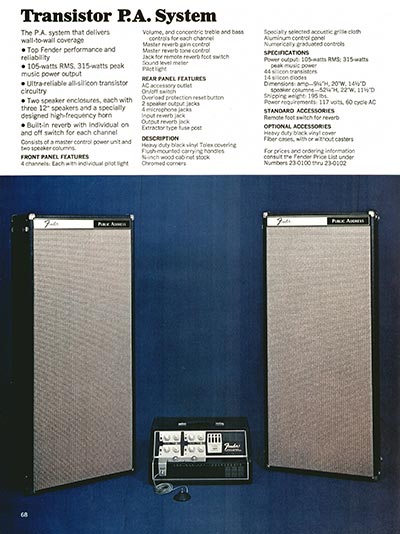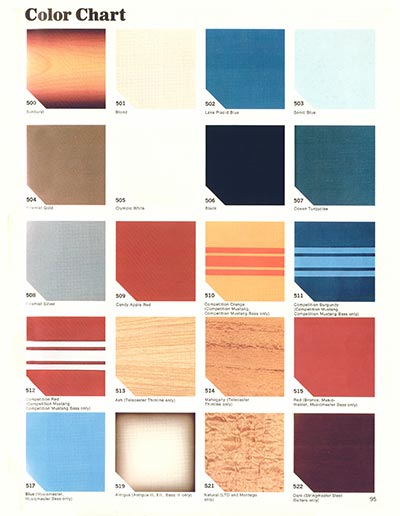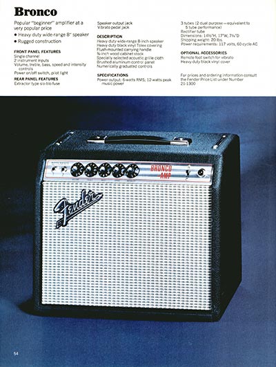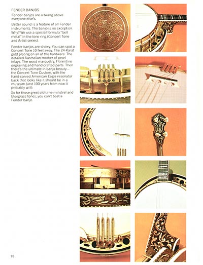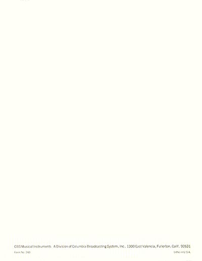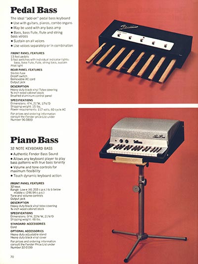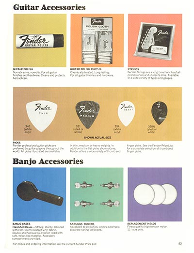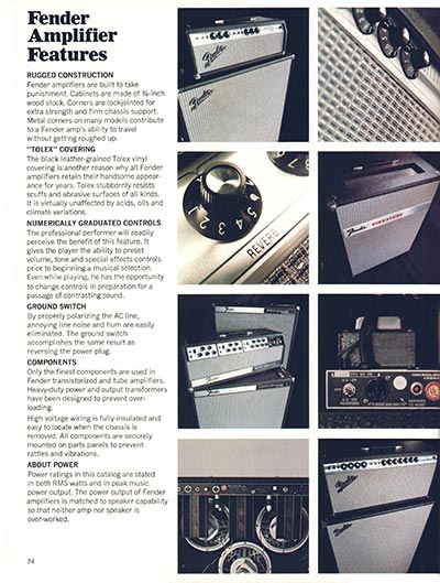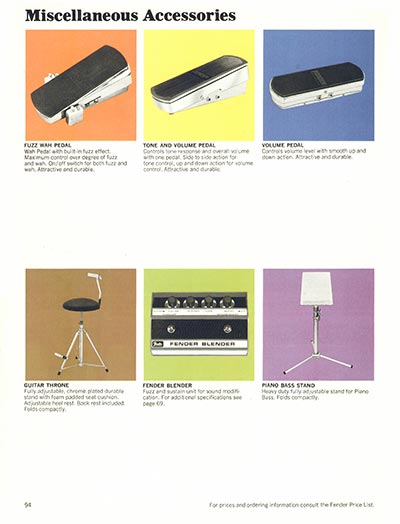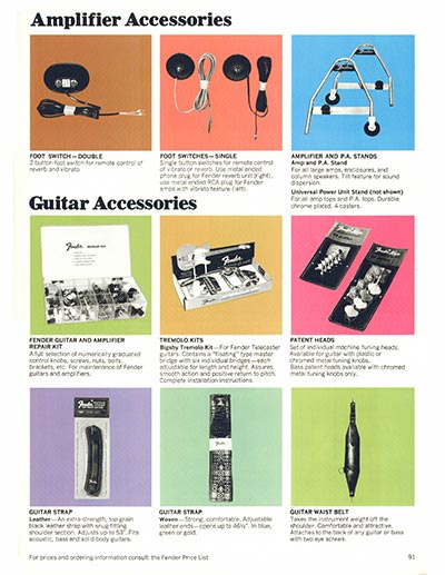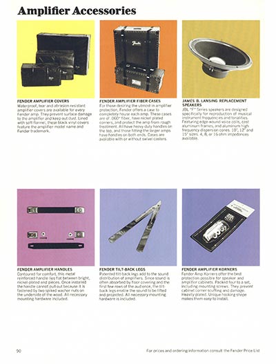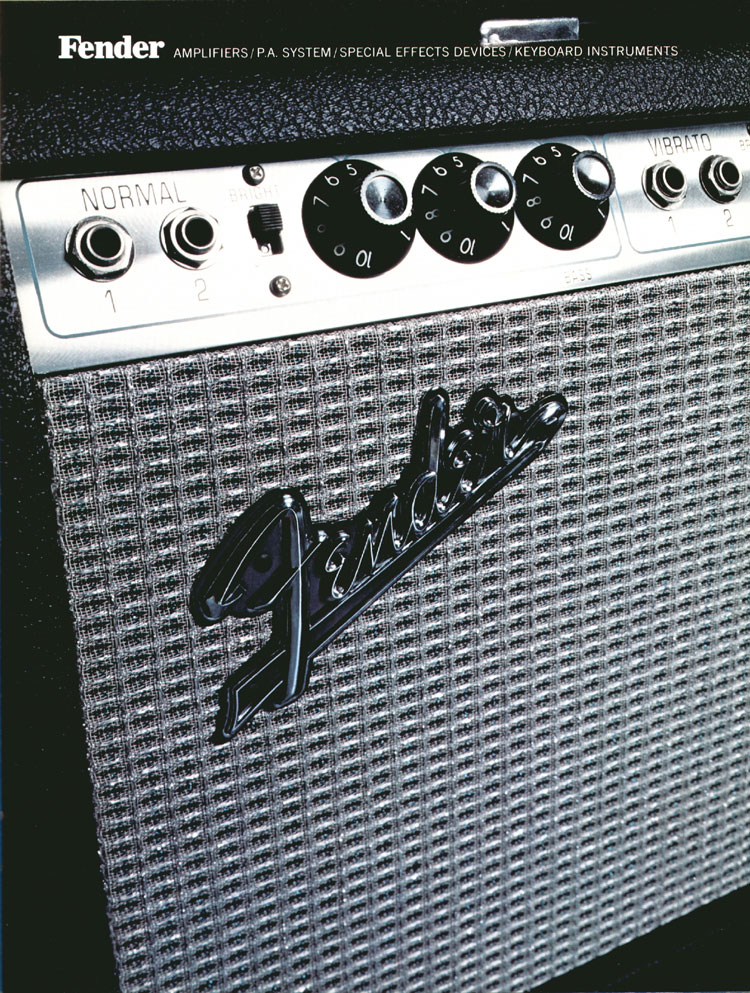 Pages 43 through 96. The second half of this catalog features Fender's large range of tube and transistor amplifiers (spread over 24 pages), as well as keyboards, banjos and a wide range of accessories. Go back to part 1 for pages 1-42: electric guitars, basses, and steel guitars. The final content page shows the 1970 Fender color chart - detailing the finish options available for Fender instruments at this time.