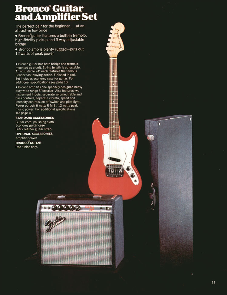 Details of the Fender Bronco guitar and Bronco amplifier set, from The 1972 catalog. The guitar and amp were available separately, but when sold as a set included a number of extras: strap, cord, case etc.