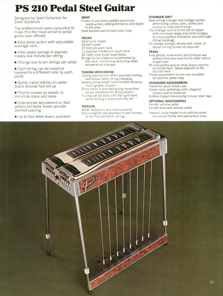 The Fender PS210 was a very fine pedal steel guitar, with two 10 string necks. Various combinations of pedals and knee levers were available, but all had the same list price of $1500 (Feb. 1972).