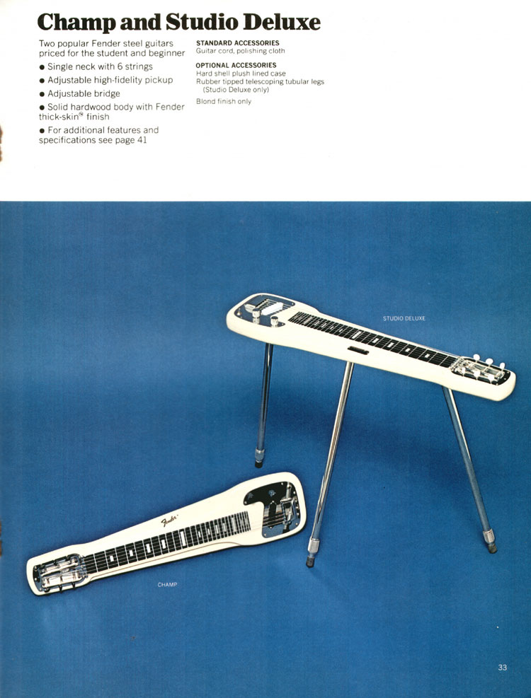 1972 Fender guitar and bass catalog page 35: Fender Champ and Studio Deluxe steel guitars