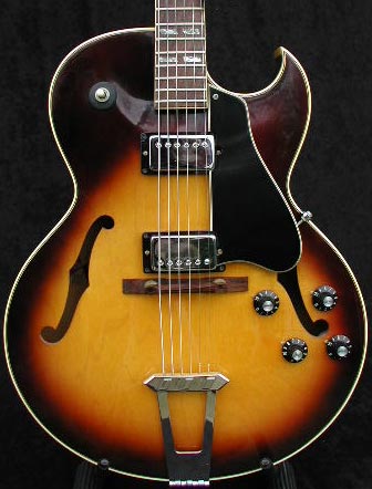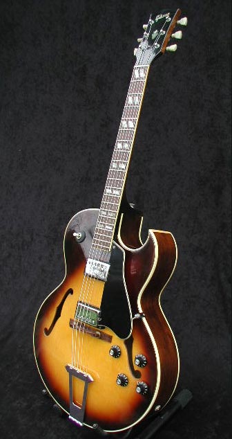 This 1974 ES-175D is one of 578 ES-175Ds in sunburst finish (compared to 193 Natural) made in that year, and had a 1974 recommended retail price of $600. It is typical of Gibson's early 70s 175s; the tailpiece is the original early 50's style, after 12 or so years of the zig-zag version (for comparison see a (1960s ES-175), and control knobs are Gibson witch-hats. Pickups (part numbers 13515 and 13516) are Gibson 'patent numbers' (so named because of the patent number sticker on the underside) and tuning-keys are Kluson model 320-VP. The free-floating compensated rosewood adjustable bridge was still in use (as it had been since 1949) although this was soon to be replaced with a tune-o-matic in 1977/78.