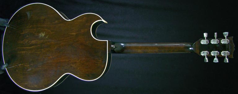 This 1979 ES-175D is one of 839 shipped that year. It had a 1979 recommended retail price of $849, plus $109 for a case. The majority shipped with a luscious sunburst finish, though this is a little darker than many with no reds (often called tobacco sunburst or antique sunburst) - compare with a 1970 ES-175D. On this guitar, only the top has the colour gradations, with the back being plain - not at all unusual on Gibson sunbursts, but quite unusual on an ES-175. The body was bound front and back, which looks superb against the deep brown 'walnut' finished back.
