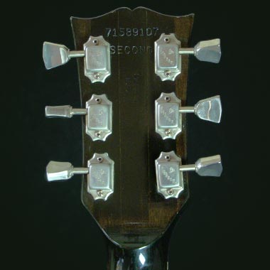 The serial number - 71589107 - tells us that this guitar was stamped on the 158th day (June 7th) of 1979, at Gibsons Kalamazoo plant, in Michigan - the 107th instrument stamped that day. This eight digit serial number stamps were fairly new at this time, having been phased in in 1977. Note the word SECOND, also stamped below the serial number. This denotes a minor flaw was detected, usually in the finish when this guitar underwent final inspection before shipping. The three pieces of wood that make up the neck can clearly be seen.
