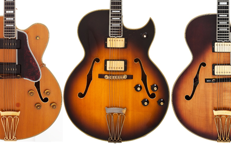 Three versions of the Gibson Byrdland from 1955, 1968 and 1974. Note the changes in pickups and body cutaway style over these years Images Heritage auctions