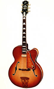 FEATURES; Carved top of the finest, close grain spruce, carved maple back with matching rims, multiple white-black-white ivoroid binding. Raised maple finger rest made to match the rims and back. Five piece laminated maple neck, ebony fingerboard with deluxe inlay design. Exquisite Citation tailpiece, special design humbucking pickup, volume control mounted on pickguard. Gold-plated metal parts and machine heads with fleur-de-lis engraving. 17" wide, 20 ½" long, 3 1/8 " deep: 25 ½" scale, 20 frets.