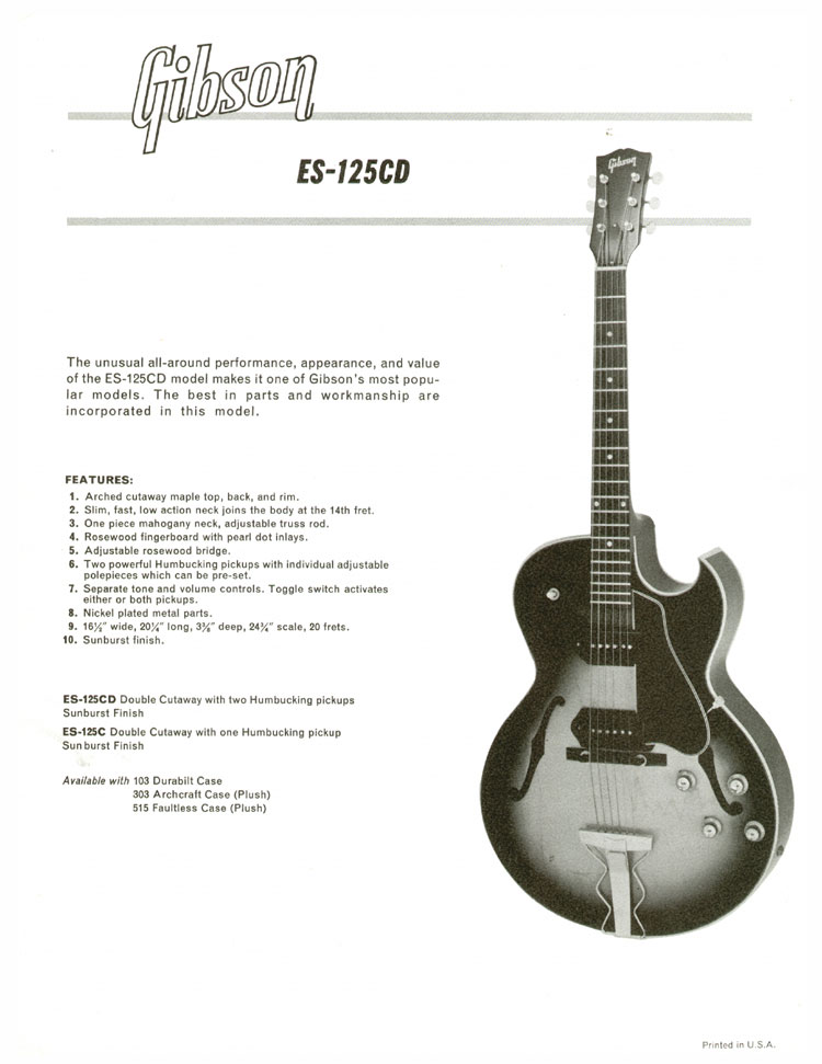 Promo sheet for the Gibson ES-125CD from around 1965, when the model was introduced. Interestingly, this guitar is fitted with the T-style tailpiece more usually seen on the ES-175D. Typically the ES-125CD came equipped with a standard trapeze tailpiece.