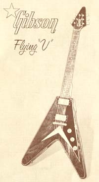The Flying V story starts in 1957, with Gibson really getting futuristic.. acknowledging that guitar players were hungry for more innovative designs in solid body guitars; designs that echoed the latest in cars, aeroplanes, rockets etc. Perhaps shapes that didn't stick to the same rounded outlines of existing hollow body guitars. Gibson President Ted McCarty came up with three solid guitars in 1958, to complement the Les Paul. They were the Moderne, the Explorer and the Flying V. Unfortunately for Gibson, sales of these lines were small (from 58-59; Explorer - 22, Flying V - 98, Moderne - never commercially available) and they were discontinued in 1959. The image on the left shows the Flying V as advertised in the 1958 Gibson catalog. Luckily Gibson only produced them in small numbers, and were not left with a lot of unsold stock, however this situation means the 1950s Vs and Explorers are some of the most sought after instruments in the world. The 1958 Catalog described the model as follows:
