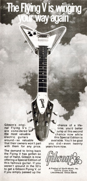 The 1970s saw reasonably good sales of the Flying V, with 1872 Vs shipped in 1975 alone. But this was certainly not due to Gibson publicity; the V had not been in any Catalog since the launch of the original in 1958, and no pricelist since 1968 (it wasn't listed until 1982). A monochrome advert (left) did appear in 1975 guitar magazines, but that was it, despite the model being shipped right through to at least 1979, or later.