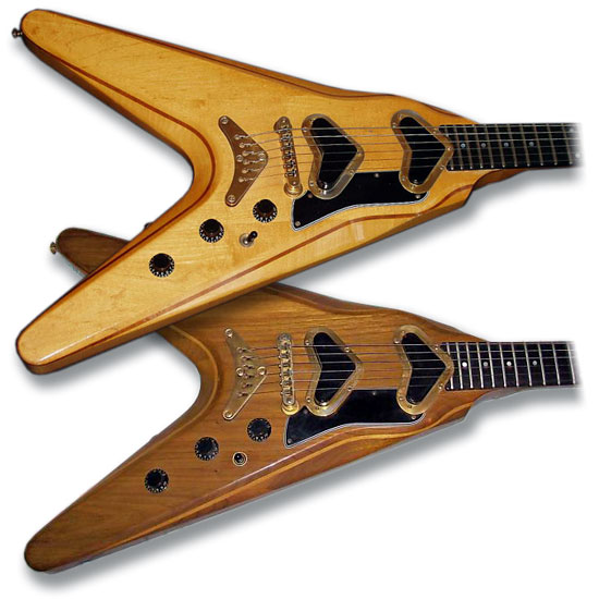The V2s construction was interesting: body and necks were five-ply walnut and maple, either w/m/w/m/w or m/w/m/w/m; initially the guitar was walnut-topped with a maple-topped version following in mid-1980. This was or course very different to the older V models that had initially been korina, but more often mahogany.