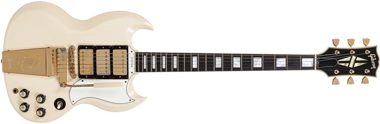 The SG Custom was the finest model in the SG line, with gold plated hardware and three humbucking PAF pickups. It was offered (initially) in white only, though later Cherry and Walnut. See more about the SG Custom here.