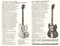 Full page early seventies advert for two Gibson solid body guitars: the redesigned Gibson SG Standard (below, Cherry finish, Bigsby vibrato) and SG Special (above, Walnut finish).