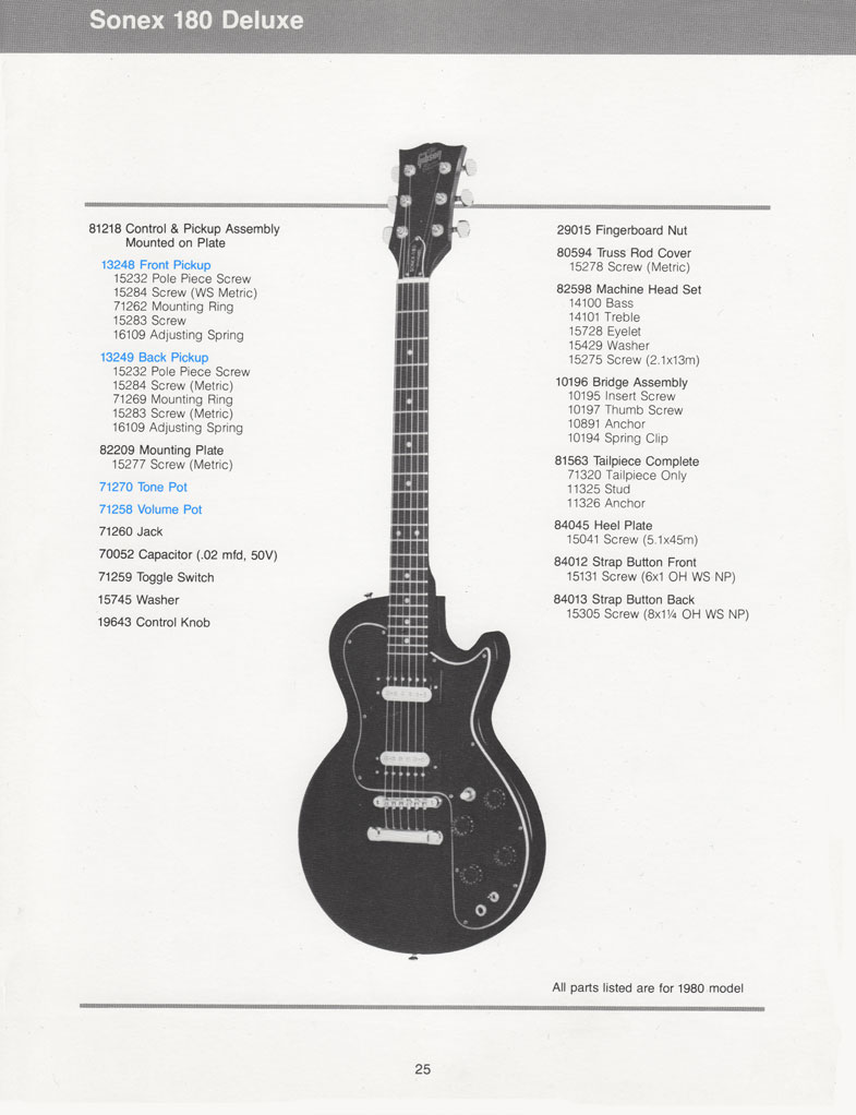 The parts shown here are for the Sonex-180 Deluxe, although the incorrect image has been used; the guitar pictured is actually the Sonex-180 Standard. Components listed in blue can be clicked for further details.